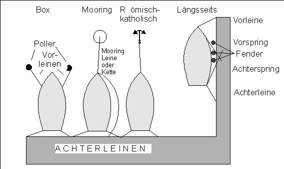 Der Anker wird vor dem Liegeplatz geworfen und das Boot rückwärts an die Pier gefahren (siehe Mooring). Wegen der verschieden Techniken und Ankerwinschen erfolgt für die Details eine Einzeleinweisung an Bord.