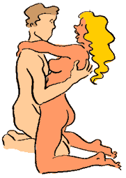 Frau und Mann knien sich gegenüber.Der Mann schiebt seine Schenkel zwischen die ihren und dringt in sie ein. In dieser intimen Stellung sind viele Liebkosungen möglich: Küsse, Umarmungen, Streicheln…