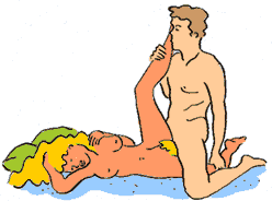 der anderen den Unterschenkel der Frau festhält. Mit ihren freien Händen