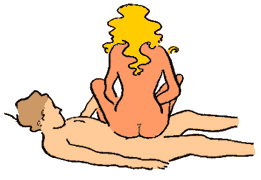 Der Mann liegt auf dem Rücken. Sie stellt ihre gespreizten Beine seitlich ab und "stülpt" sich über sein Glied. Die Frau bestimmt den Rhythmus. Sie kann sich selbst streicheln, während das Glied bei dieser Position tief eindringt.