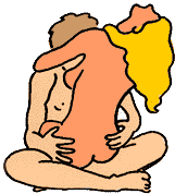 Der Mann sitzt im Schneidersitz auf dem Bett, die Frau klettert auf seinen Schoß. Während er in sie eindringt, bestimmt er den Bewegungsrhythmus mit seinen Händen und liebkost ihre Brüste mit seinem Mund.